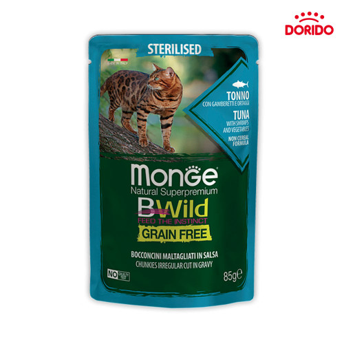 پوچ گربه مونژه استرلایزد مدل t با طعم ماهی تن، شاه میگو و سبزیجات